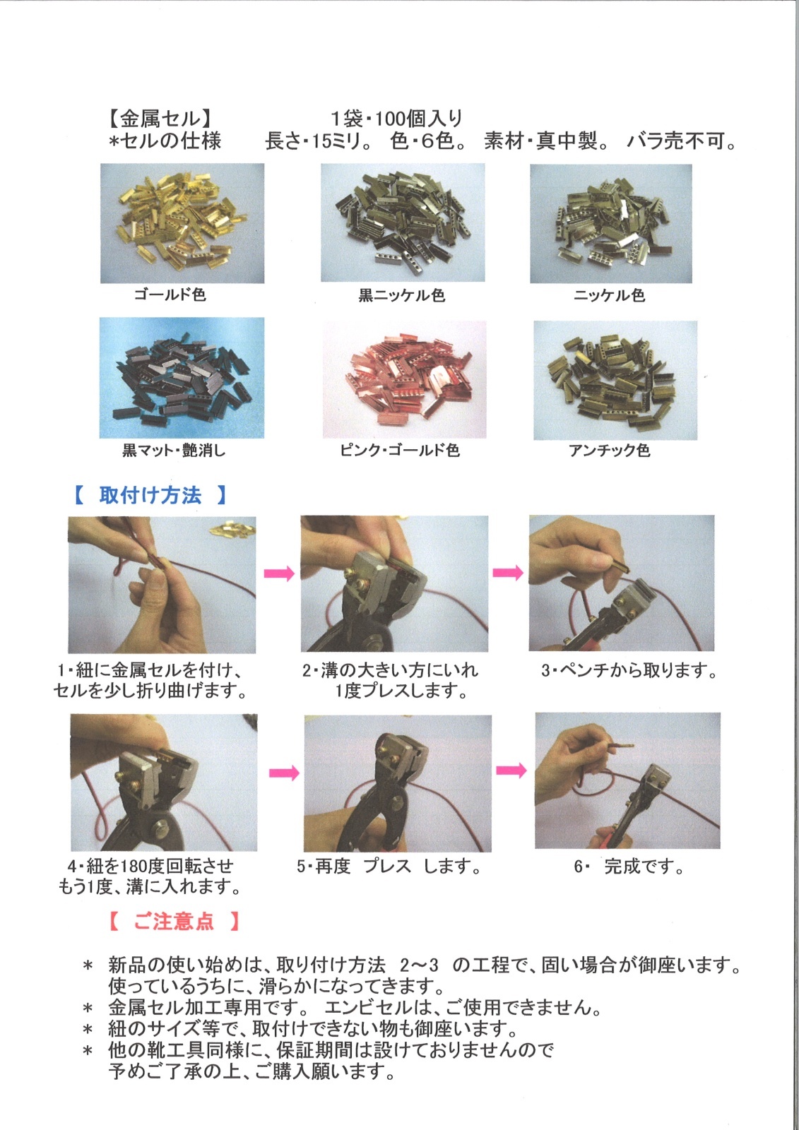▼お買上時には、お試し用で、金属セル8個(2足分)かNYロービキ丸ひも黒 4M分をサービス品で同梱いたしますので、下側の関連用品から、ご依頼下さい。(ネット購入時限定) ▼